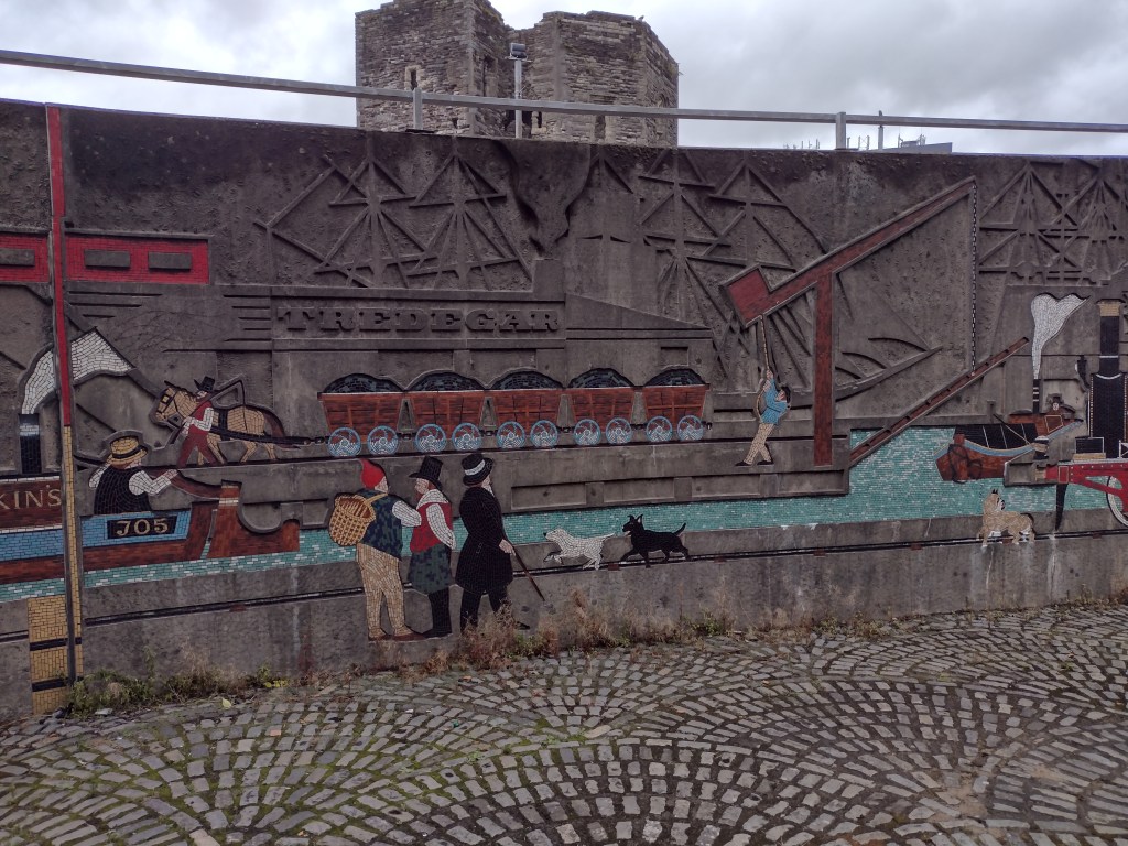 It’s hard to find much of Mediaeval origin in Newport, particularly with St Woolos Cathedral closed to visitors [and apparently pilgrims], but the castle was bigger than expected. Here’s a glimpse of it behind a mosaic celebrating Newport’s industrial heritage.