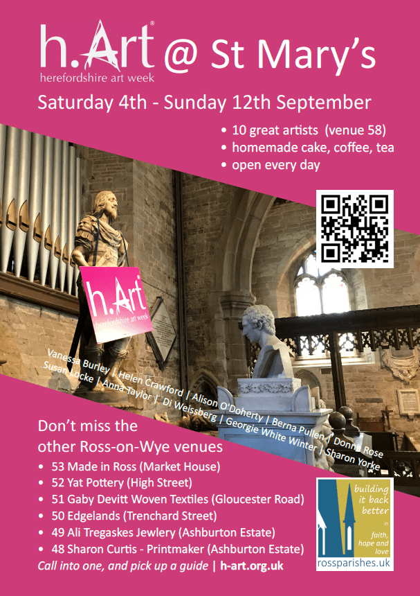 St Mary’s is proud to be taking part as a venue this year and we have 10 artists who will be showing and selling their work in church from Saturday 4th September onwards. We are just one of seven Ross venues so why not make a day of it.
