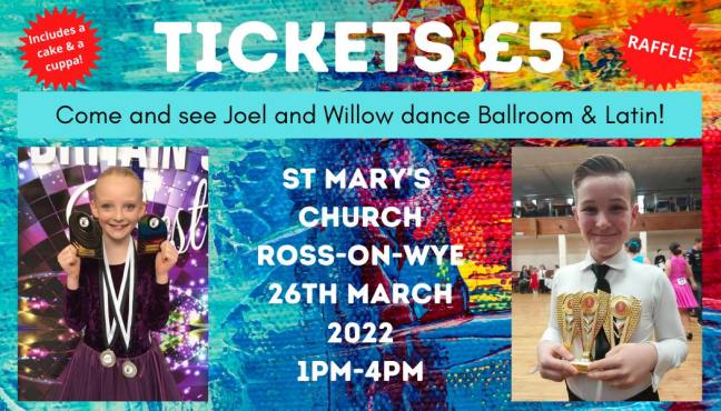 One of our young church members, Willow, has taken it upon herself to organise a tea dance with her dancing partner, Joel, at St Mary’s Church in Ross to raise money for their imminent competitions in Blackpool! The tea dance will be held on March 26th from 1pm-4pm, and they would love to see you there. Tickets are £5 and include a free cuppa and a cake! There will also be a raffle, dance demonstrations, opportunities to learn a new dance as taught by Joel and Willow and generally lots of good fun! Get in touch with Charlotte Taylor or Katy Marsh via facebook messenger if you would like to purchase tickets, and we can put them in named envelopes on the door for you once payment has been received. Thank you, and we look forward to seeing you there!