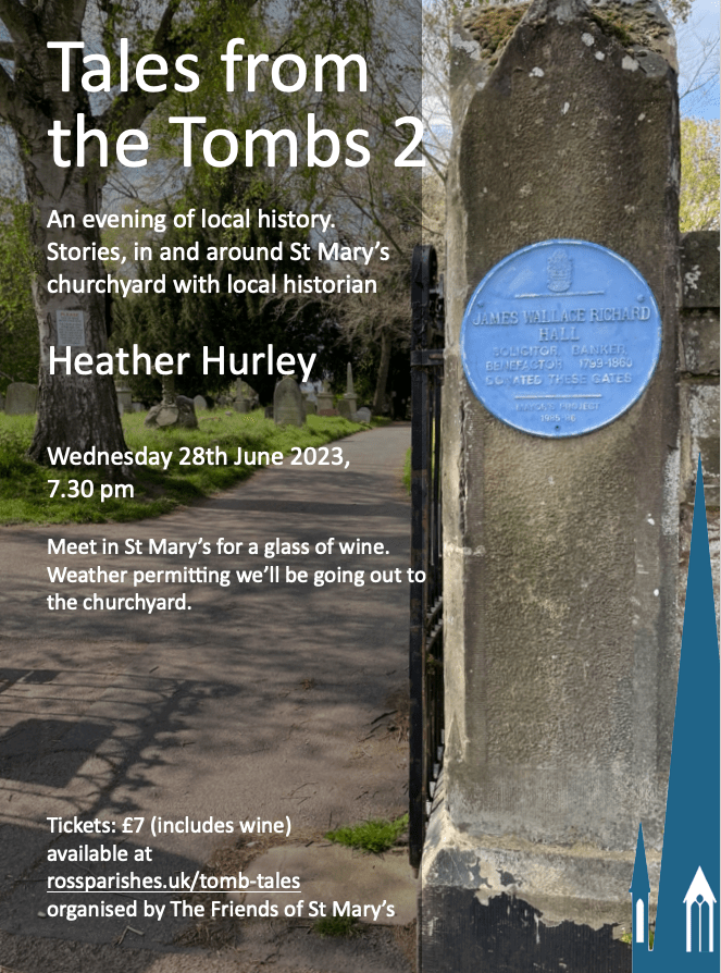 Heather Hurley gave a very popular local history talk last year; she’s back for part 2. Come along and hear the stories from the lives of some of the people buried in St Mary’s Churchyard. Join us for a glass of wine and Heather’s talk. After that bring your glass out into the churchyard as we search for the graves of the people featured in the talk.