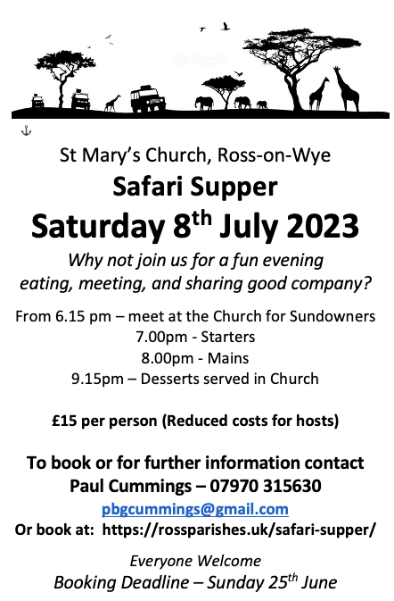 On the night we meet in the Church for ’sundowners’ and then head off to our first hosts. We are not looking for fine-dining but some fun and an opportunity to share fellowship with one another. Further details can be found on the St Mary’s website: https://rossparishes.uk/safari-supper/.