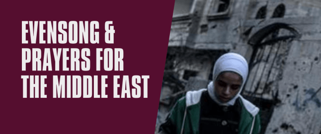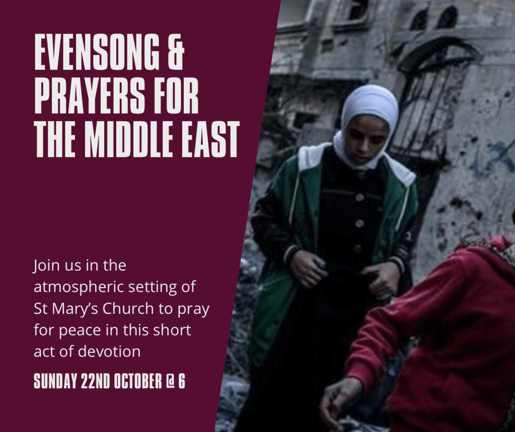 Join us in St Mary’s this Sunday evening (22nd October) at 6 pm for a short specially constructed service to pray for Peace in the Middle East.