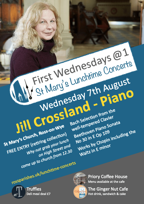 Today (Wednesday 7th August) we welcome back Jill Crossland for a piano recital featuring Bach, Beethoven and Chopin. A concert lasting about 45 minutes.