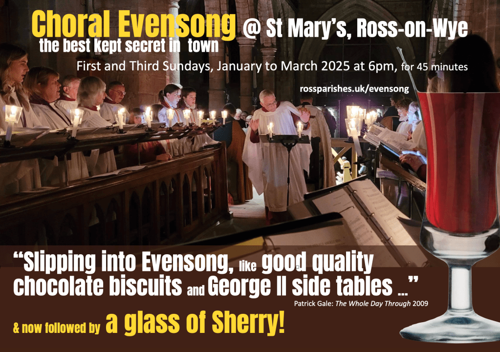 It’s the third Sunday of the month (19th January) which means there’s another wonderful service of Choral Evensong at 6pm in St Mary’s – the service that reaches the parts other services can’t! This time the choir is singing music by two greats of the Edwardian era, Charles Wood and Charles Villiers Stanford. And now … join us for a glass of sherry after the service – how very English (well not the sherry, the concept!)