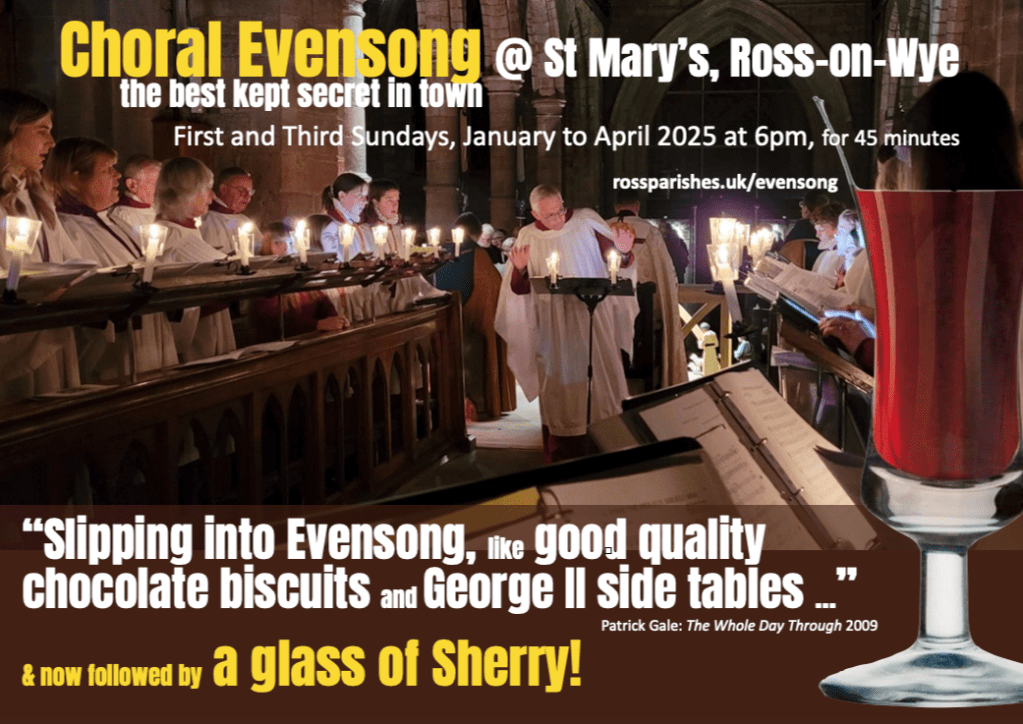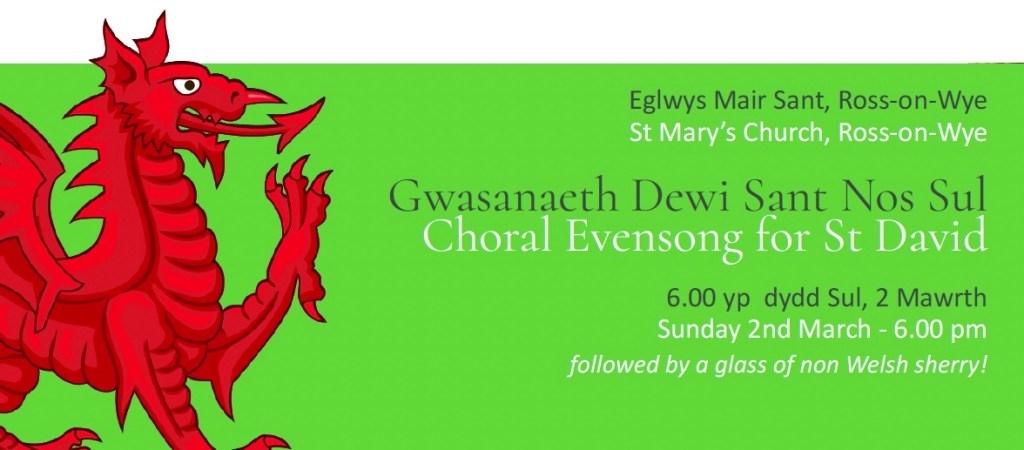 There’s another splendid service of CHORAL EVENSONG at St Mary’s at 6. This time all the music is by Welsh composers and some of the service will be in Welsh too.