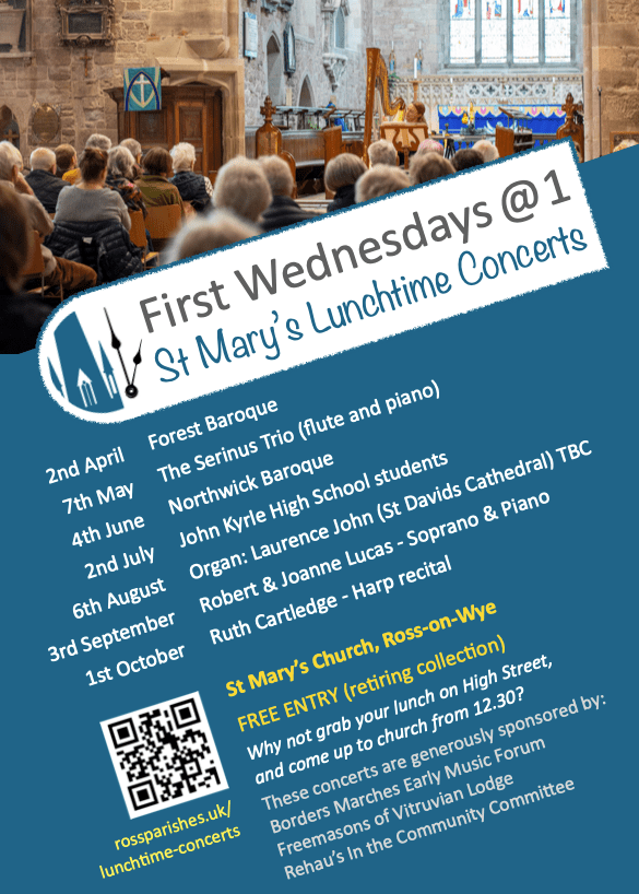 Join us, perhaps with your lunch, whenever you like, the concert begins at 1. For this month only homemade soup and a bread roll will be up for grabs in church from 12. It’s all very informal.