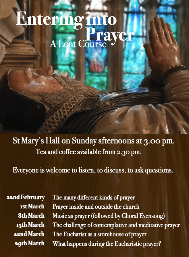 You might like to come along to our Lent Course which starts this Sunday at 3.00pm in St Mary’s Hall. The first session will examine different kinds of prayer.