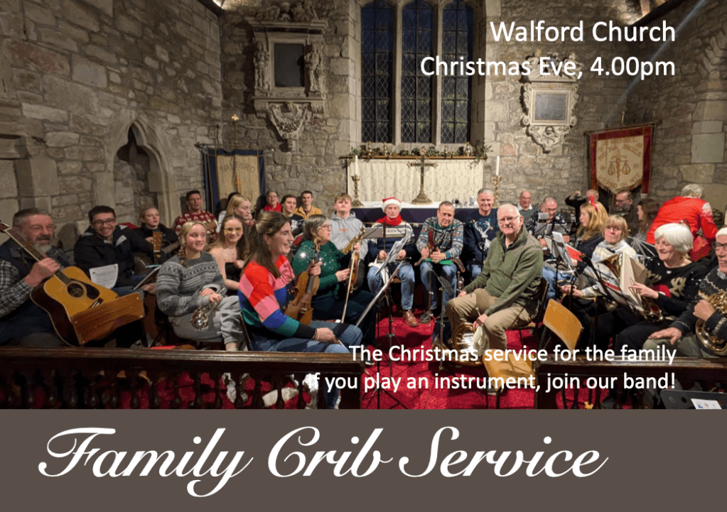 Another very popular service. A major feature of this is the scratch band that rehearses during the afternoon and a band leads the music. A very user friendly service for all, especially those with young children. The service will finish about 5.00 pm. Children are invited to dress as stars, angels, shepherds, sheep, cows, oxen… Overflow parking at Walford Village Hall.