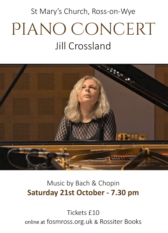 This is your last chance (before Wednesday 18th October) to buy tickets for Jill Crossland’s Piano Recital at St Mary’s Church, Ross-on-Wye. Tickets available here https://www.ticketsource.co.uk/fosmross/t-dvllyry